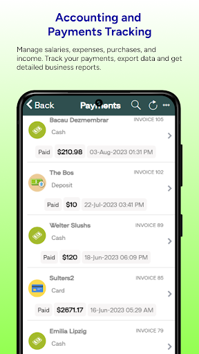 The app accepts Cash, Check, Credit Card, and PayPall payment options. You can collect payments from your clients on the spot.