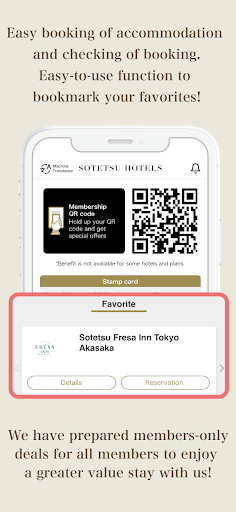 This is the SOTETSU HOTELS CLUB official app, able to be used at five hotel brands:SOTETSU FRESA INN, SOTETSU GRAND FRESA, HOTEL SUNROUTE, SOTETSU HOTELS THE SPLAISIR and THE POCKET HOTEL BY SOTETSU.