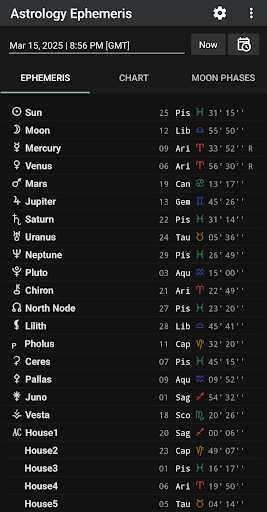 - Astrology ephemeris of the Sun, Moon, Mercury, Venus, Mars, Jupiter, Saturn, Uranus, Neptune, Pluto, Chiron, North Node, Lilith and asteroids (optional).