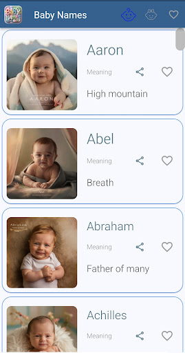 Discover the perfect name for your baby. This app offers you a wide selection of names for boys and girls, each accompanied by a charming image. Explore, choose and save your favorite names in a personalized list so you can make the most important decision with peace of mind and ease.