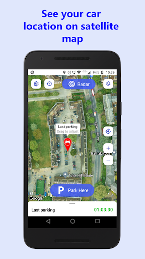 • The last parking location is clearly shown on the map. Both normal and satellite maps are supported. You may drag the car position marker to adjust the car location directly on map.