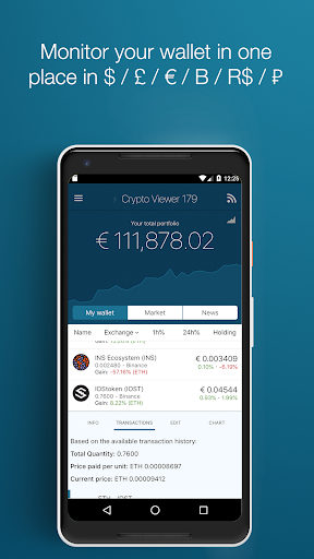 Real-time news from multiple sourcesBasic candlestick ChartsWallet overviewCoins informationNote: I started this app because I couldn't find anything I like to track my portfolio. This app has no advertisement and I use it every day, just as I hope you do. I improve it and develop it in my spare time. If you like it a good review is a great reward. If you don't like it, a constructive negative review or an email is appreciated.If you would like to see a particular feature or you find a bug, you can let me know on cryptoviewer@obsidianart.com or Telegram https://t.me/cryptoviewer_app