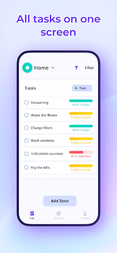 Never miss a beat in your home cleaning schedule with our smart reminder system. Lerto's home cleaning reminders operate on a ""It's Time / Not Time"" principle. Our app ensures your chores remain on track with color-coded alerts that indicate when it’s time to tackle that chore: green for tasks not due, yellow for tasks that need your attention, and red for overdue tasks.