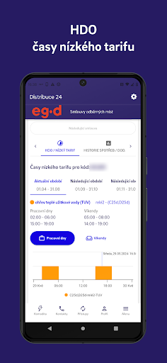 You will get an overview of your collection points, including technical details. You will see low tariff (HDO) switching times, data from consumption/delivery measurements, information about outages or faults at your consumption points. At the same time, you can solve selected requirements for the distributor via the application, e.g. entering self-reading.