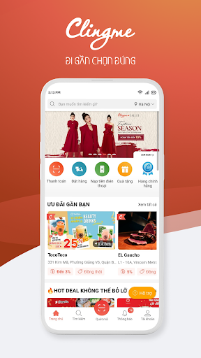 With nearly 5,000 great deals per day at more than 300,000 shopping locations nationwide, just use the Search feature on Clingme and you'll find the closest and best places around you, from restaurants to shops. street food, fashion, spa to pharmacy, gas station, ATM ...