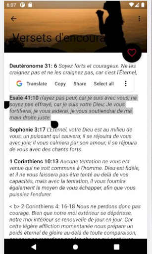 We are proud and happy to publish the French Bible verses app. Completely in French verse and you can share French Bible verses through social networks with French people.