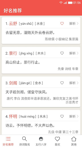 1.在唐诗宋词元曲、四书五经、诗经楚辞、易经、二十四史、传记游记中起名取名,有出处、意境好、音韵美。当之无愧的起名大师、取名神器、起名大全、取名宝典。