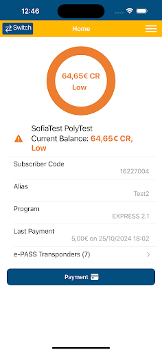Additional summary information on the Home screen includes: the subscriber code, the Commercial policy programme that the user is subscribed to, the amount and timestamp of the last payment and the information of the Transponders-Account cards assigned to the subscribers’ Electronic Toll Collection (ETC) account.