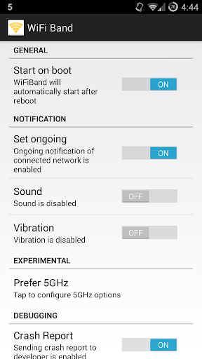 WiFi Band is an Android app that notifies the user about the radio bandwidth (2.4GHz or 5GHz) and the SSID of the connected WiFi network.