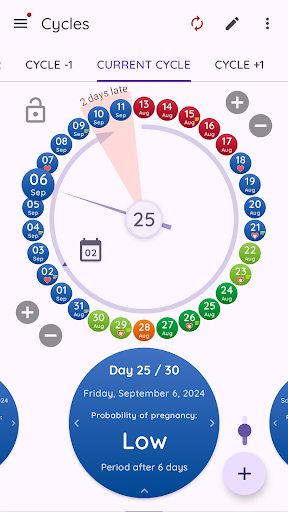 • Pregnancy Planning Mode: Also considers the range of your cycles but focuses on low conception probability values to target fertile days for conception.