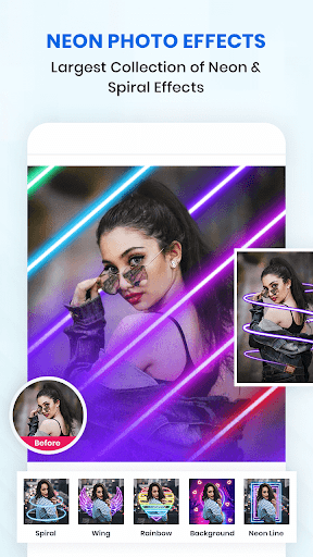 Neon Photo Effect: Create your Neon art photo with different background and neon arts like Colorful, Line, Spiral, Wing, Love, Air, Bird, Fire, Flower, Friends, Funny Photo Effect, Music, Rainbow, etc.