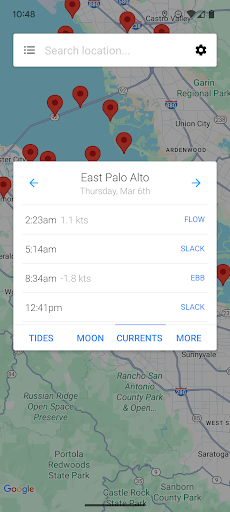 - See predictions for the currents (the slacks, ebbs and flows for each day) at selected locations around the US! Just try to view tide times as you normally would, if there's a currents station nearby you'll see an extra tab for "Currents".