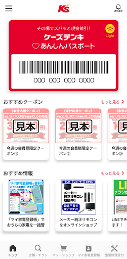 By registering your "K's Denki Anshin Passport" number in the app, you can take advantage of four peace-of-mind services such as "cash discount" when making purchases at K's Denki stores. We will periodically deliver coupons exclusive to Passport members.