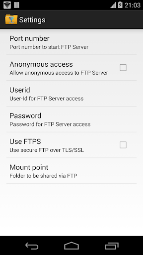Port number should be greater than 1024 as binding to ports like 21 will not be possible on non-rooted phones. The default port number is configured to 2221 and can be changed from settings screen. For security reasons, anonymous access is not enabled by default. It can be enabled from settings screen.
