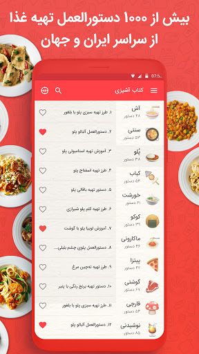 برنامه کتاب آشپزی و آموزش آشپزی پاسخ همه پرسشها و نیازهای شما برای یک آشپزی تمام عیار را میدهد. برنامه کتاب آشپزی با دارا بودن انواع دستورالعمل غذاهایی متنوع و لذیذ در دسته بندیهای مختلف از جمله: انواع آش غذاهای سنتی نوشیدنی سالاد غذاهای قارچی غذاهای گوشتی ماکارونی کوکو خورشت کباب پلوها غذاهای فرنگی انواع دمنوشها انواع غذاها با مرغ غذاهای دریایی انواع پیتزا انواع دسر غذاهای مناسب برای ماه رمضان تمامی نیازهای شما را برای یک آشپزی راحت و بی دردسر اما بسیار دلپذیر برآورده میکند به علاوه طراحی ساده اما چشم نواز محیط کاربری برنامه آموزش آشپزی لذت استفاده از این برنامه را برایتان دو چندان میکند.