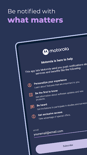 Motorola Notifications is here to improve your experience with your Motorola smartphone. If you opt-in, it sends periodic product-related information, including notifications on software updates, tips & tricks and information about new Motorola products and services. You will also receive invitations to participate in surveys about your experience with Motorola.