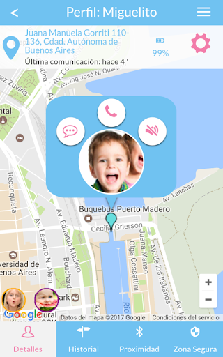- Meet the geolocation location on the map (using GPS, cellular 3G and WiFi) and know where the child is.