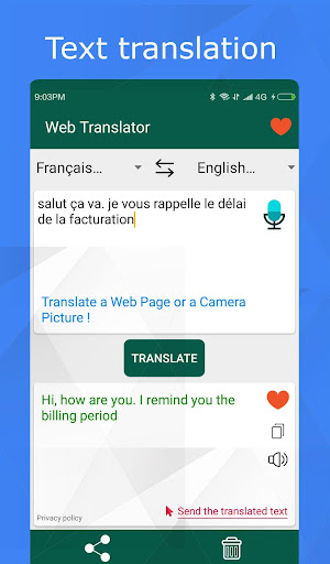 This app allows you to translate text, photos, camera, web pages as well as voice from any language to your wanted language. It is flexible and simple to use. It supports voice translation, text and camera pictures translations.