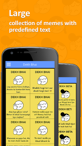 "Dekh Bhai" Meme right on your fingertips. "Dekh Bhai" is basically an Indian language (Hindi) term which means "Look Brother". Use this app to create hilarious memes and share with your friends.