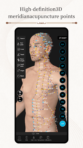 ● Fine acupoint anatomy: with one click, switch to the human body acupoint anatomy mode, the anatomical structures beside each acupoint and the anatomical layers where the needle tip pierces are clear and easy to understand, effectively avoiding the problem of accidentally piercing into dangerous organs during acupuncture.