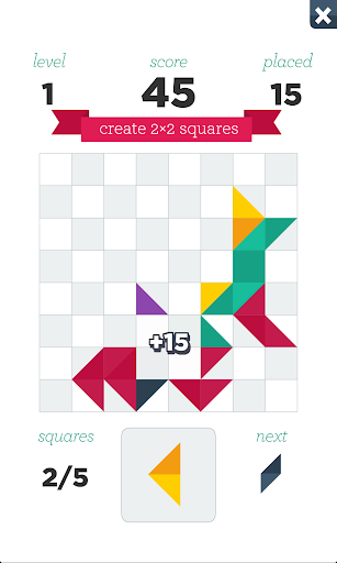 If your shapes form a square of at least 2×2, the square will vanish from the board. However, if you play strategically, you can clear a block that is larger than 2x2 squares: you will get more points for this!