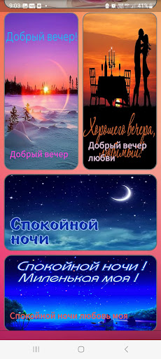 In the category you will find a large selection of beautiful postcards for congratulations in the evening. You can install this application on your phone for free and use it every night. These cards allow you to show care and respect to your friends and loved ones. But you may not even think that they are a great way to win the heart of a loved one. For this, only persistence in relation remains.