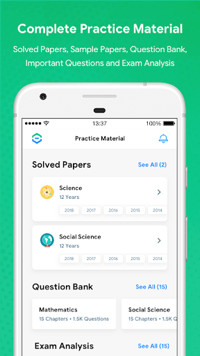 App offers comprehensive practice material essential for exam preparation and to score high marks. Practice material complete range includes Previous 12 Years Solved Papers (with original paper copy), Chapter-wise question bank, Important questions, Sample papers and graphical exam analysis prepared by subject expert teachers.