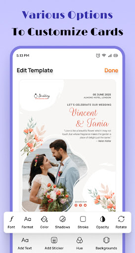 Stop wasting time with expensive designers. Create beautiful wedding cards anytime, anywhere, right from your phone.