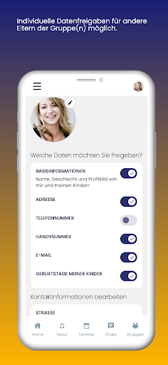 If your child cannot go to the daycare center due to illness, for example, you can inform the staff at your facility easily and conveniently using the app's integrated absence function. The existing address book enables you to comfortably make direct contact with other parents in the group, the caregivers of your child or with the daycare management. You can also upload profile pictures for your child and yourself and specify which of your contact details should also be visible to other parents. Automatically by email or push message - you decide whether and how you want to be informed about calendar entries, news, chat messages or uploaded files.