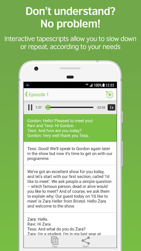 * Interactive audio scripts allow you to repeat hard-to-hear phrases or new vocabulary easily. Plus, pitch control means you can slow down the audio speed if the speaker is a bit difficult to understand.