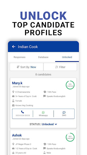2. You can explore the candidate database page & filter the candidates based on your preferences. After finding the candidate, unlock them & reach out to him via call or WhatsApp text