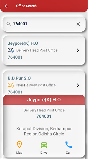 Offline Pincode search has feature to find nearest post office, locating post office on Google Map and Making call to Post office