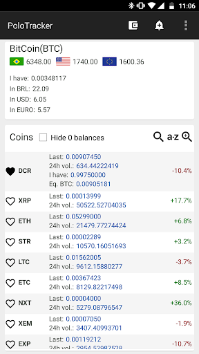 Now, you also can see your currencies and its values in Bitcoin, euro, dollar and real.