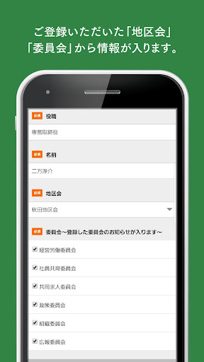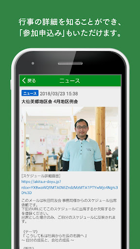 It is an application that supports activities of Akita ken Small Business entrepreneurs. Notifications will be delivered to smartphones and tablets that have your main information selected during registration, so you will not miss it. From the application, you can see the details of the events held in each district meeting every month and check the events of the committee.