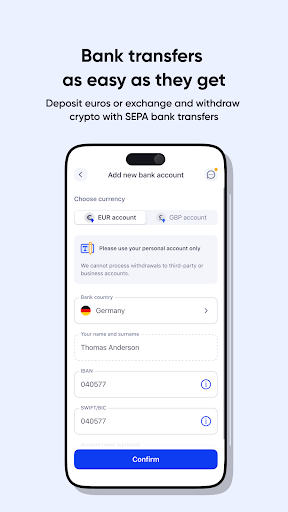 Receive euros from any SEPA bank almost instantly. Buy crypto with bank transfers. And of course sell your crypto to withdraw money to your personal bank account!