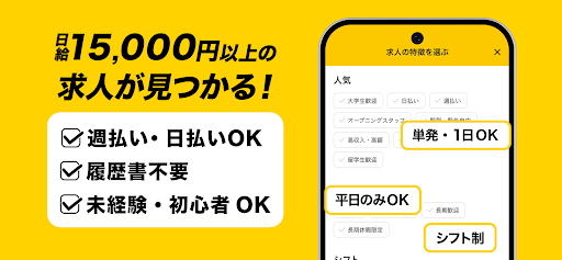 ・A wide range of search axes such as area, job type, line/station, characteristics, and free words to help you find a part-time job