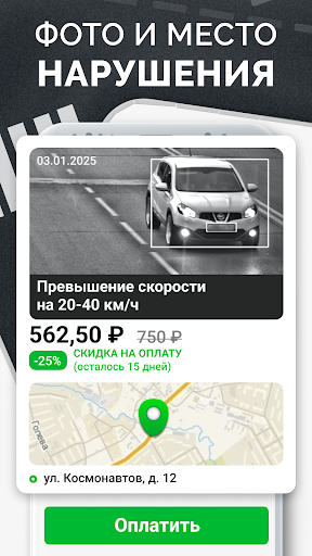 Our application is connected to the federal database: all traffic police fines are official and always up-to-date. You receive not only the amount and the article of the Code of Administrative Offenses, but also traffic police fines with a photo if the violation was recorded by a camera.