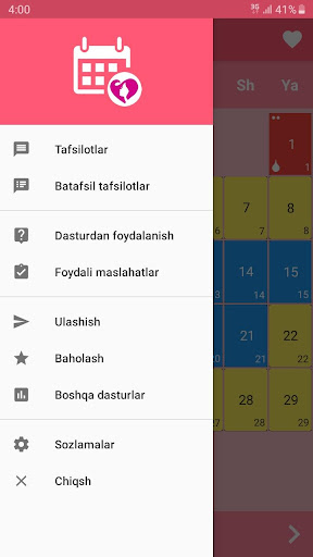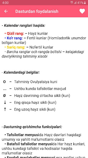 • Tafsilotlar menyusida Hayz davrlari haqidagi umumiy va yahlit ma'lumotlarni olasiz