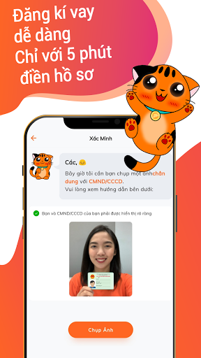 Just download the MoneyCat app, no need for complicated documents, just take a photo of your ID card. The leading online loan consulting application in Vietnam helps customers access financial resources, quick loan times and interest rates and service fees suitable for the majority of customers.